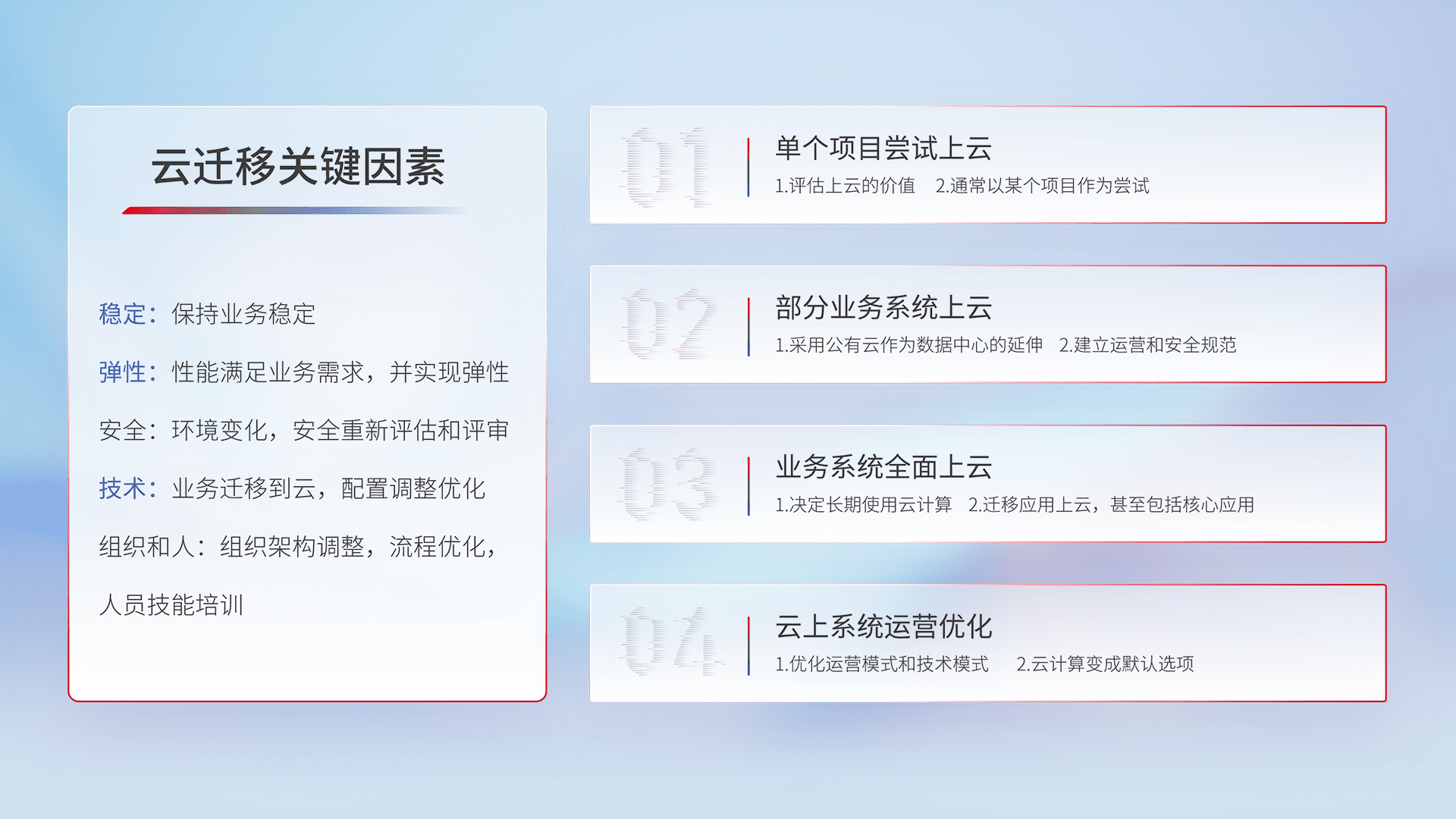 结合实际业务,,,,从规划设计、、、、云平台选型、、、云原生改造、、、、数据迁移、、、、集成交付,,,迁移全过程为客户识别最佳上云路径,,,做好风险识别管理,,设计网络架构、、、身份权限、、、安全审计合规、、、操作审计、、日志审计、、、、监控告警策略、、多站点容灾设计等,,,,对云上基础设施进行整体规划,,,提升IT治理水平,,,,以满足弹性、、、高可用、、高性能的需求。。